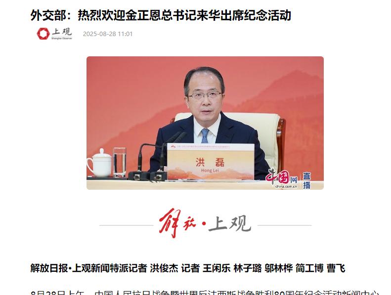 外交部:热烈欢迎金正恩总书记来华出席纪念活动 2025-08-28 11:01 上观新闻