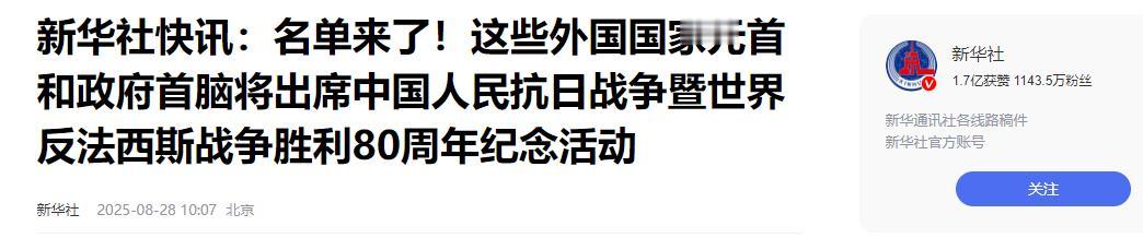 参考信源:新华社快讯:名单来了!这些外国国家元首和政府首脑将出席中国人民抗日战争暨世界反法西斯战争胜利80周年纪念活动 2025-08-28 10:07 新华社