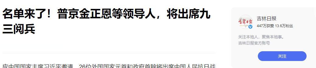 名单来了!普京金正恩等领导人,将出席九三阅兵 2025-08-28 10:17 吉林日报